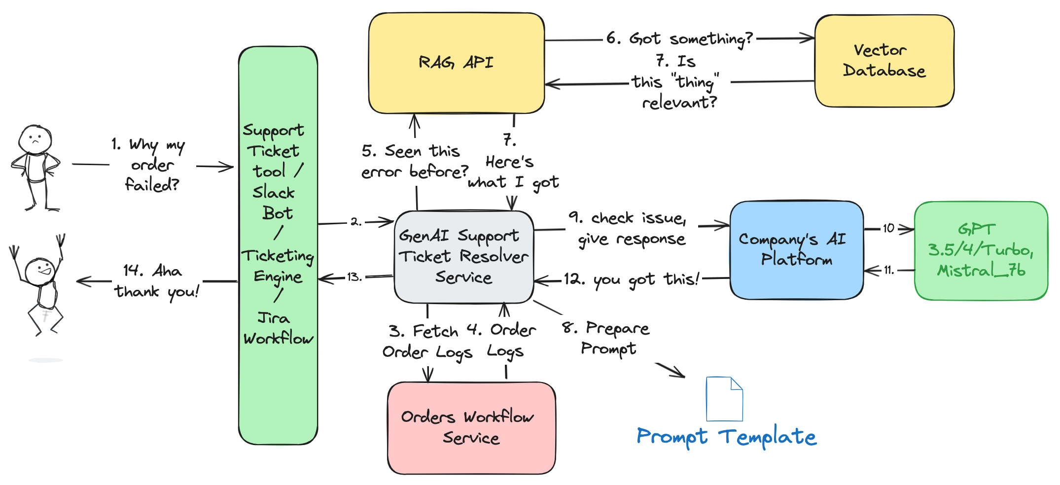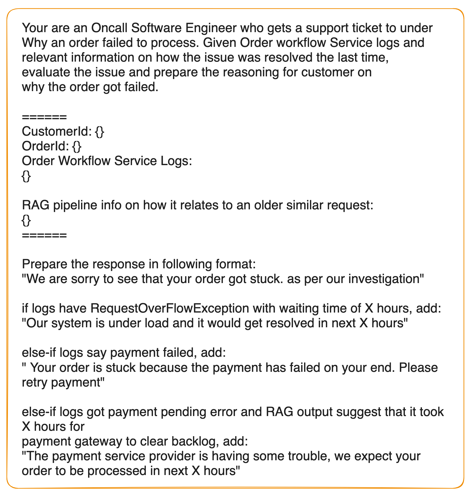 Your main Gen AI service parses ticket details. These include the order number, customer ID, and timestamps. It then calls the Order Workflow Service API to fetch order details, logs, and potential errors.
